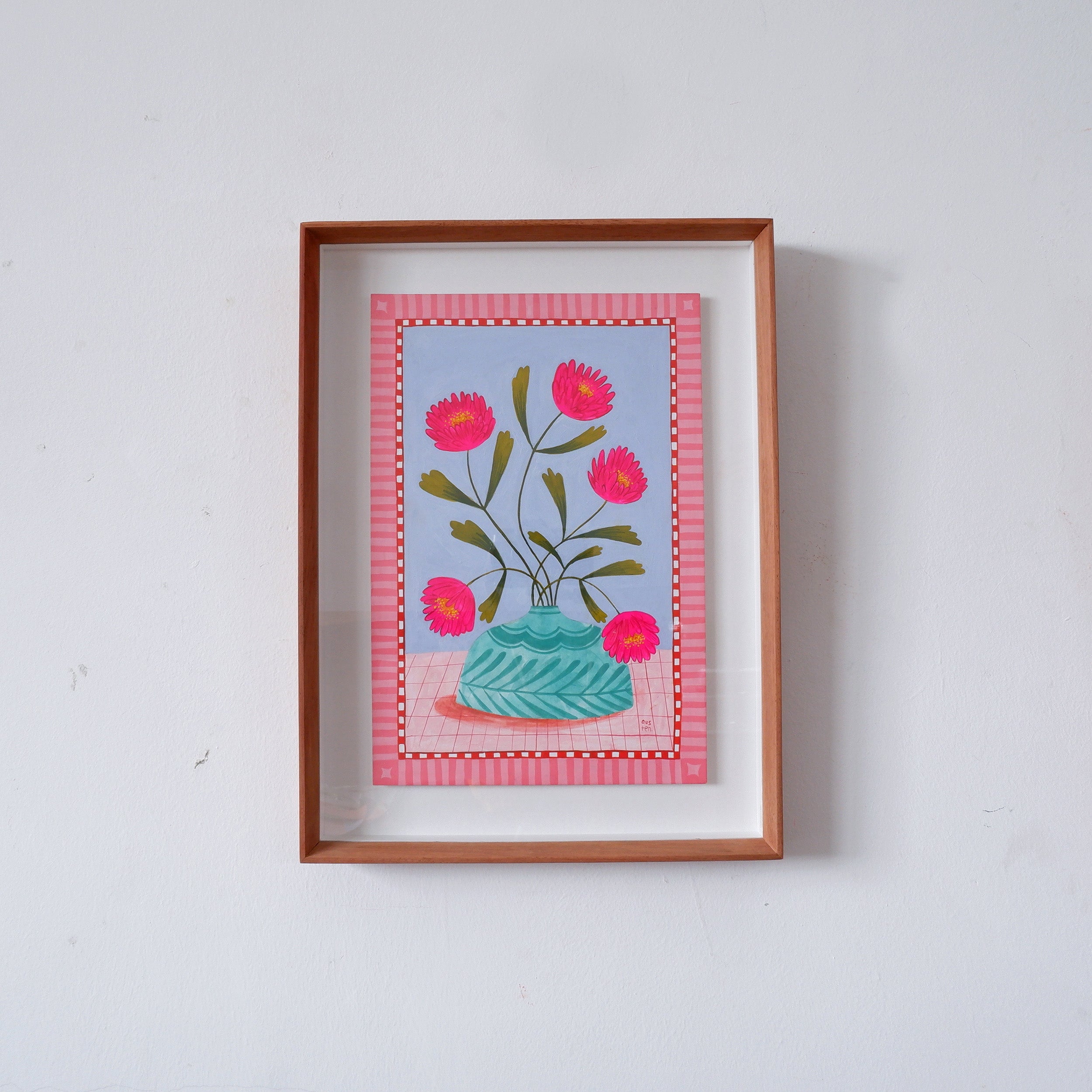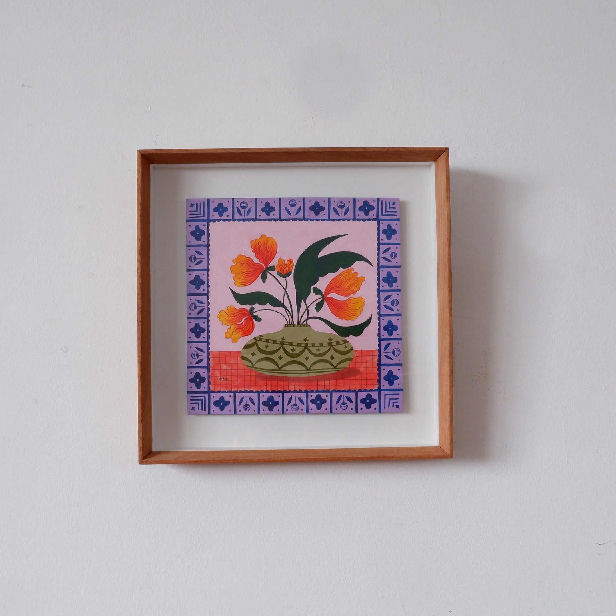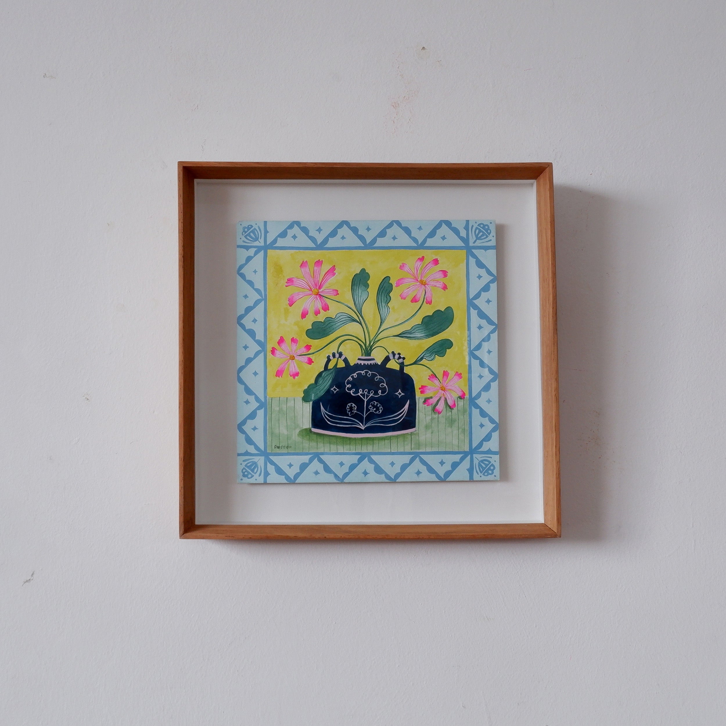 This collection of artworks has been named after my once a year tradition of ‘chasing the light’. Bright blooms emerge from dark as night backgrounds, colourful patterns abound and my usual joyous foray into colour remains at play.