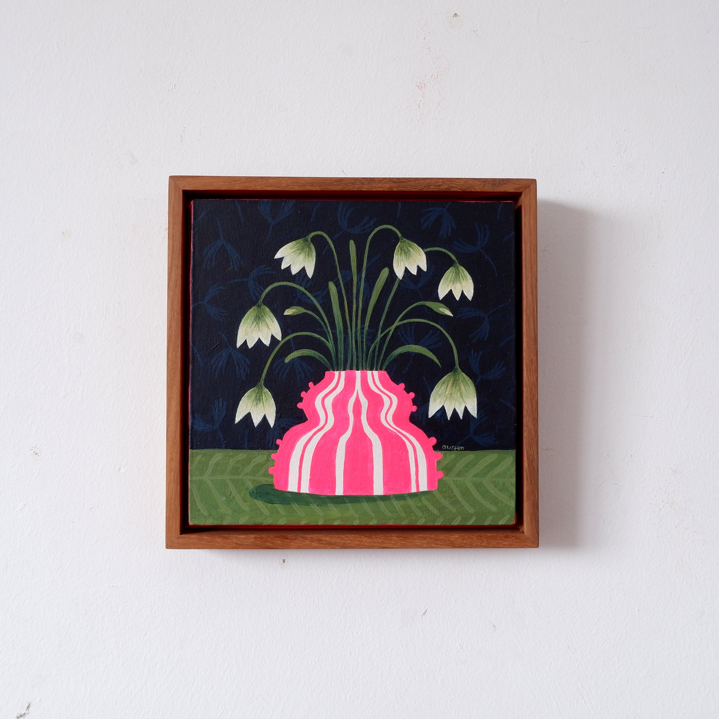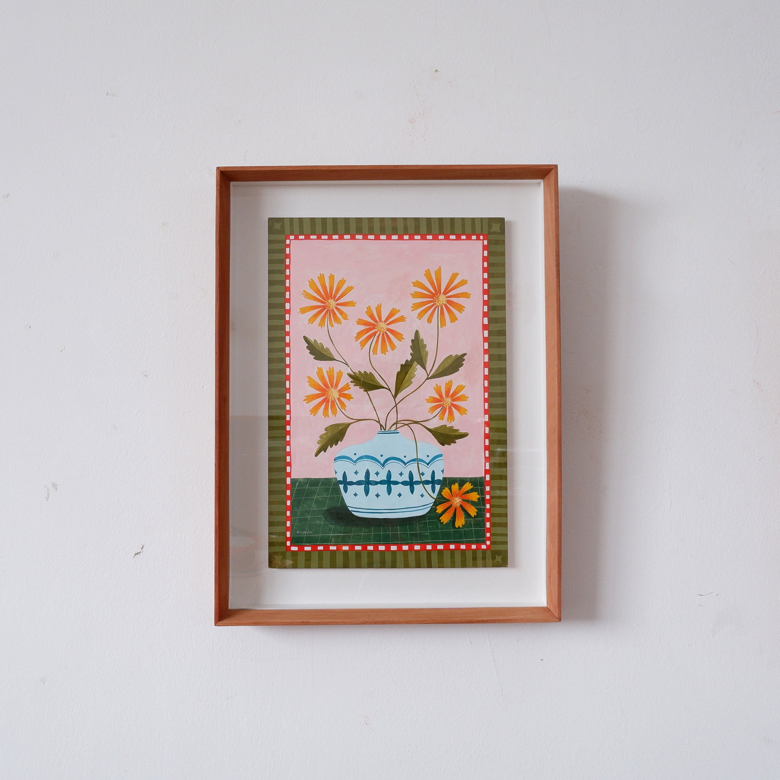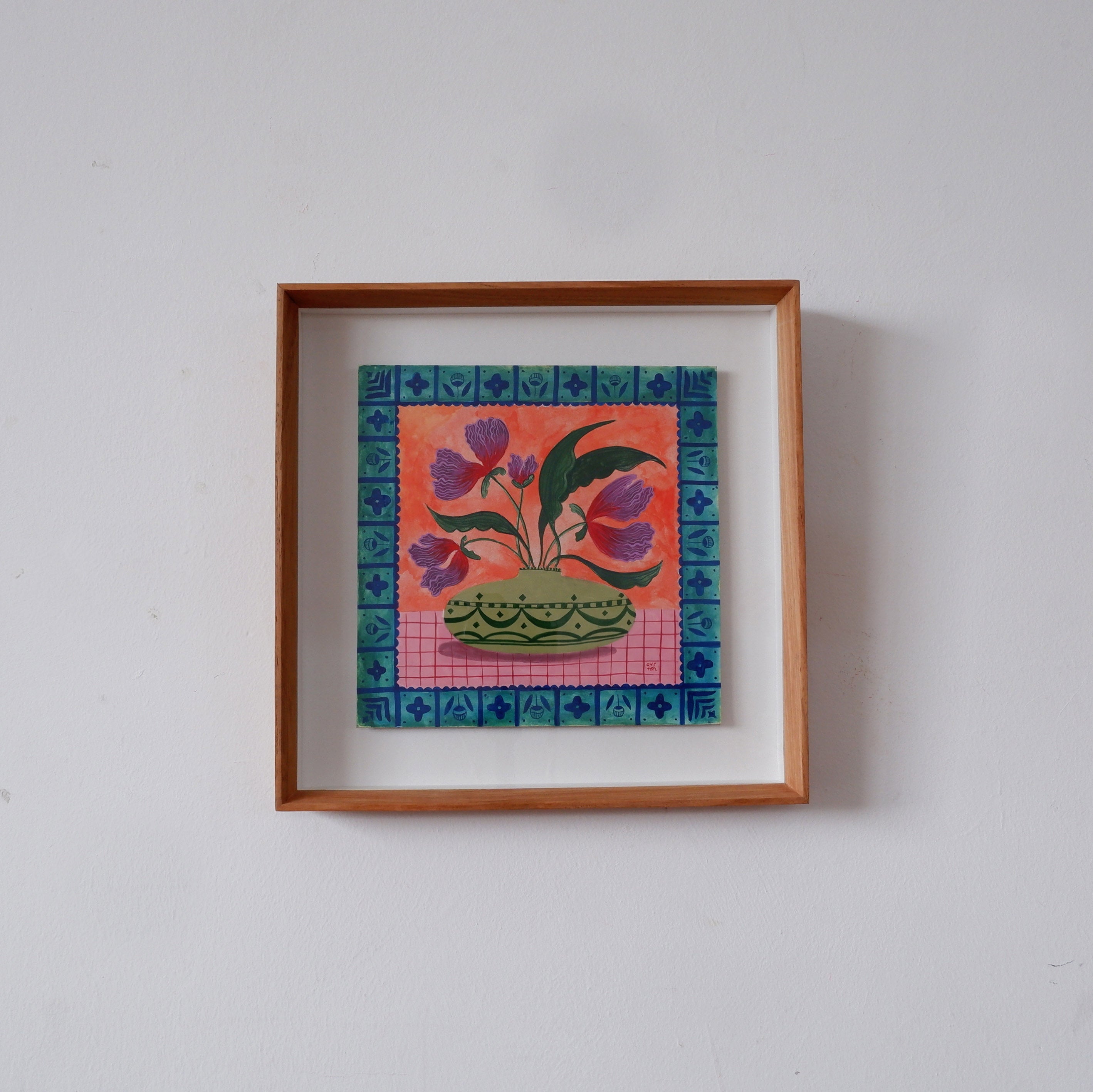 This collection of artworks has been named after my once a year tradition of ‘chasing the light’. Bright blooms emerge from dark as night backgrounds, colourful patterns abound and my usual joyous foray into colour remains at play.