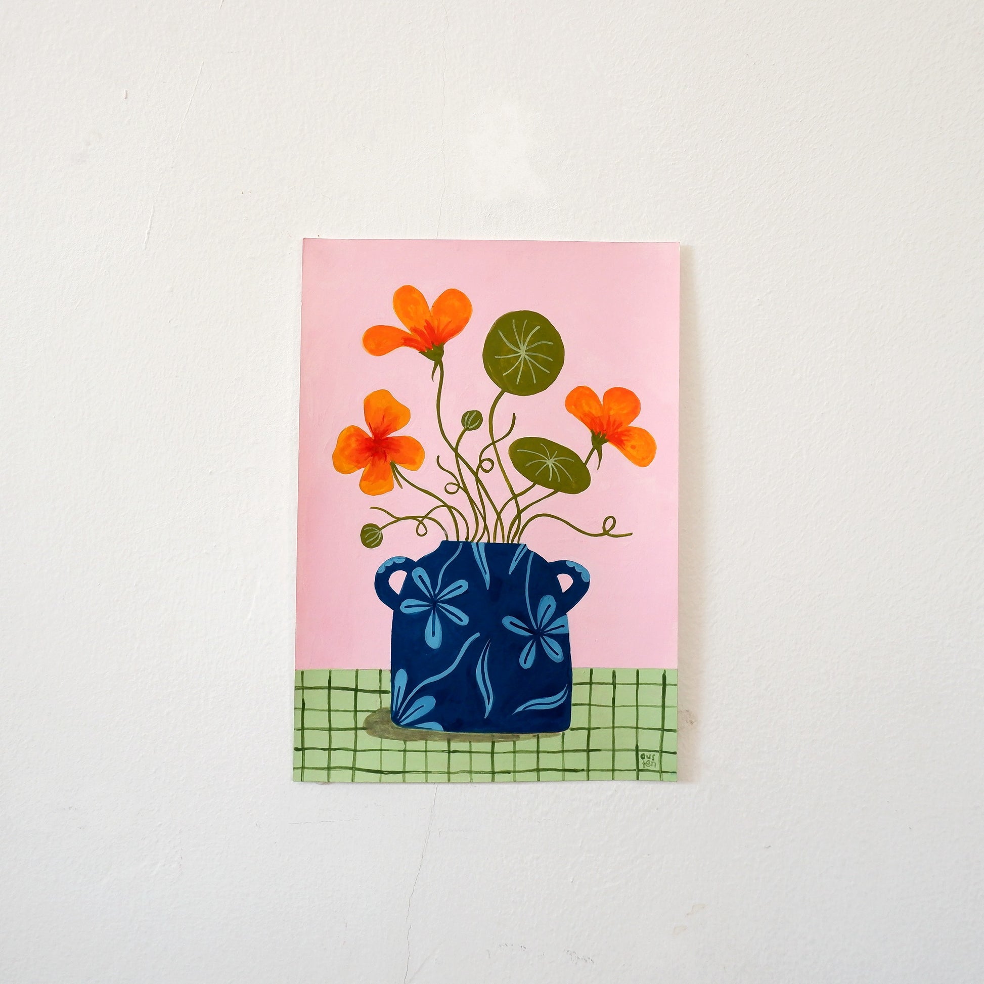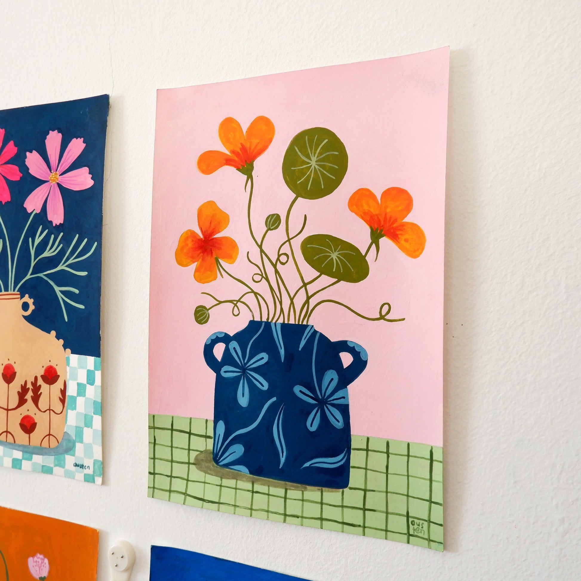 Towards the end of 2023, much transpired; both joyful and heartbreaking, challenging and freeing, and, in the midst of it all, I began to make flower paintings. I worked freely, choosing bold colours at whim, adding patterns and motifs to vases and tablecloths freehand and overall, extending my sketchbook play, outside of my sketchbook.