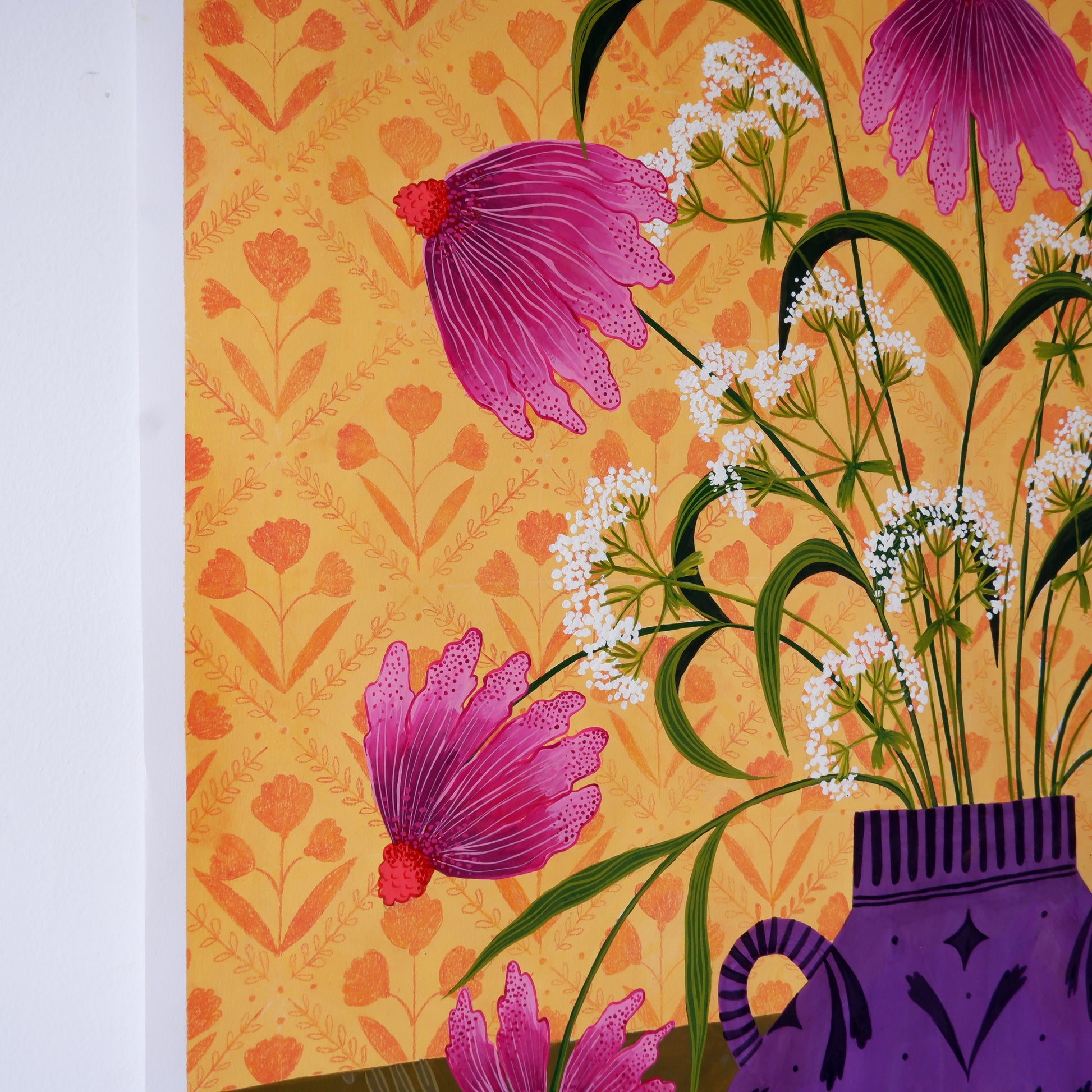 Towards the end of 2023, much transpired; both joyful and heartbreaking, challenging and freeing, and, in the midst of it all, I began to make flower paintings. I worked freely, choosing bold colours at whim, adding patterns and motifs to vases and tablecloths freehand and overall, extending my sketchbook play, outside of my sketchbook.