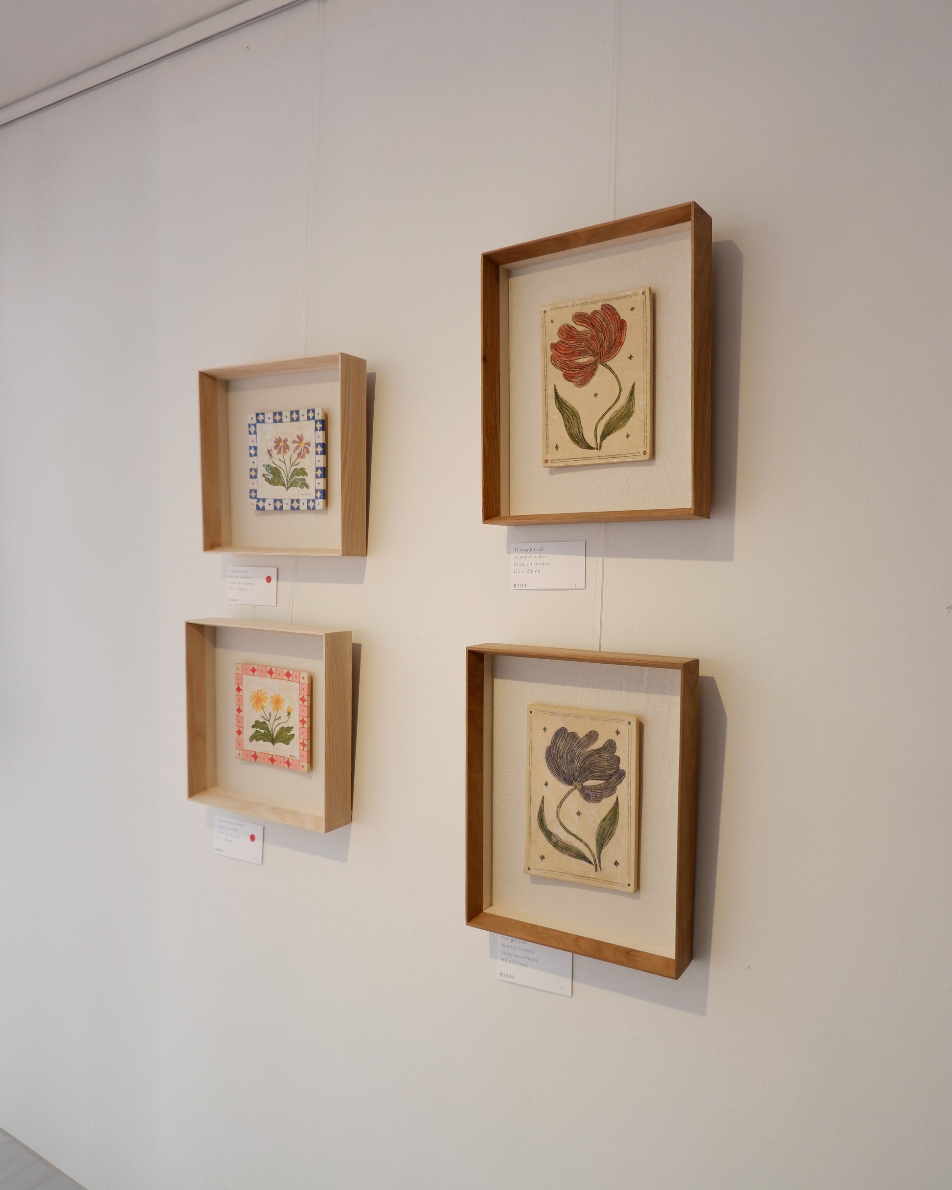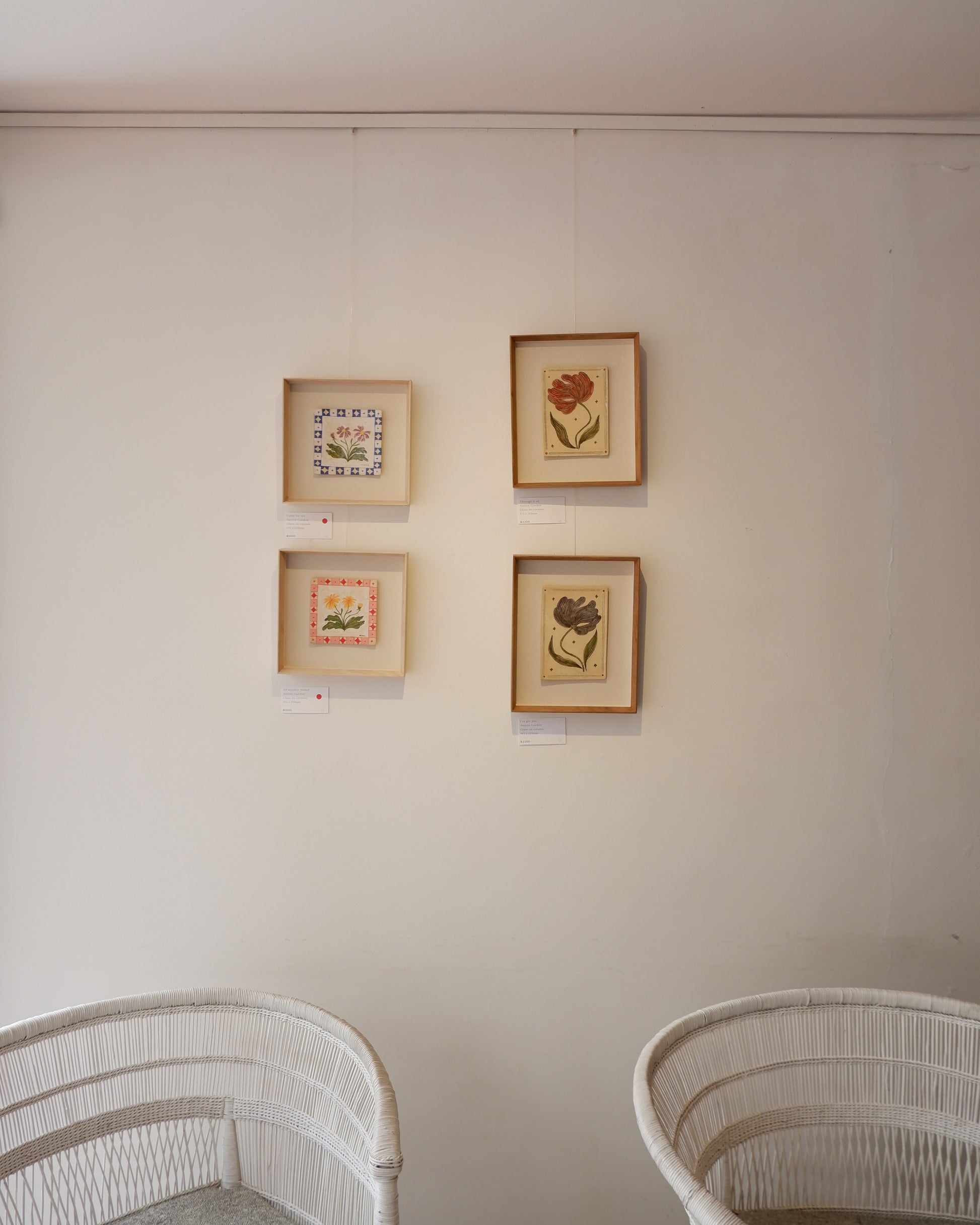 In my work, elements of symmetry, harmony and distinct contrast appear together, paired, as ever, with abounding florals. Carefully selected colours, shapes and patterns represent diversity, abundance and longevity. This show reflects, in titles and essence, what it is to have female friendships.