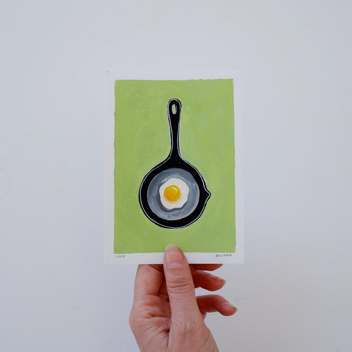 Single serving of a fried egg in a cast iron pan, on a light green background