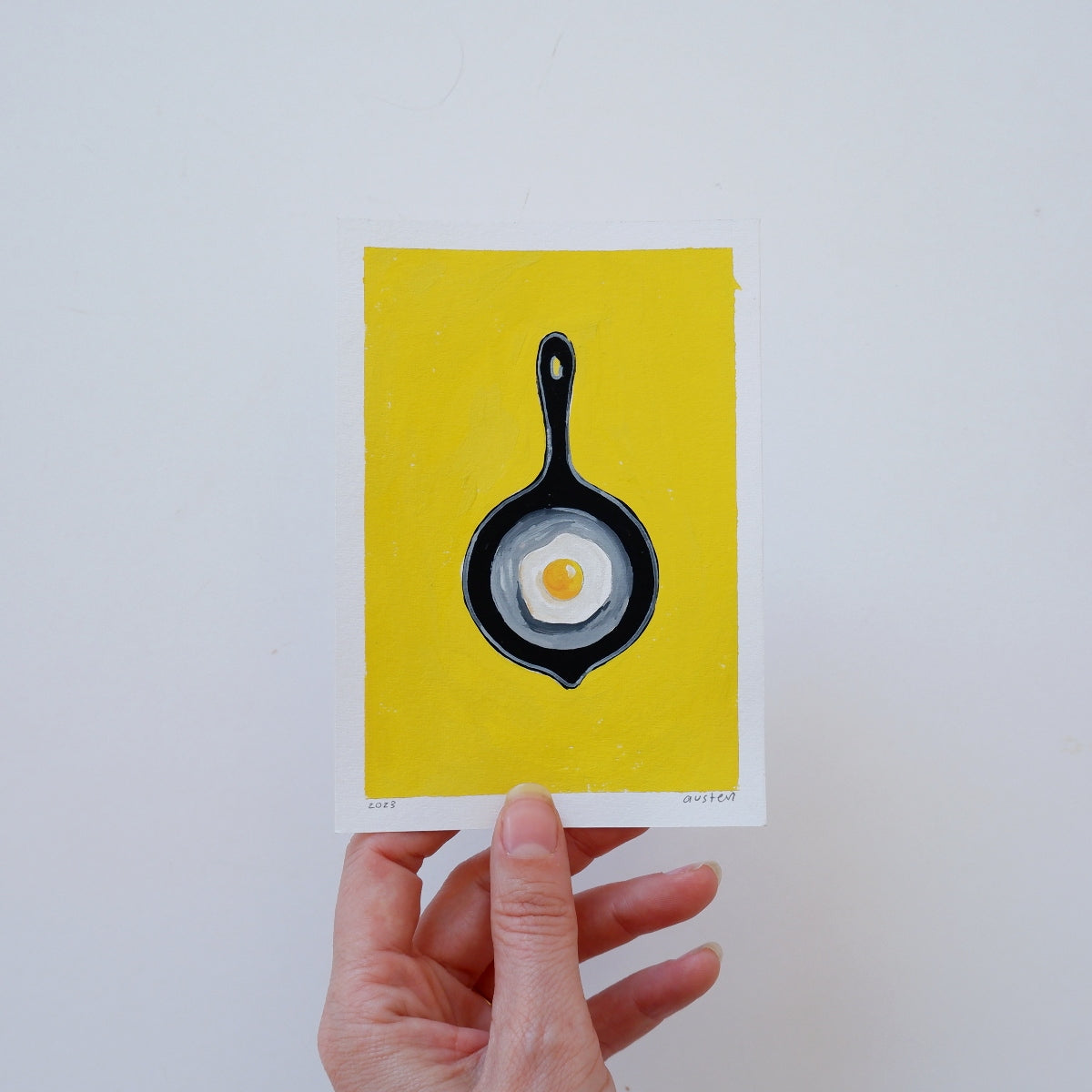 Single serving of a fried egg in a cast iron pan, on a bright yellow background