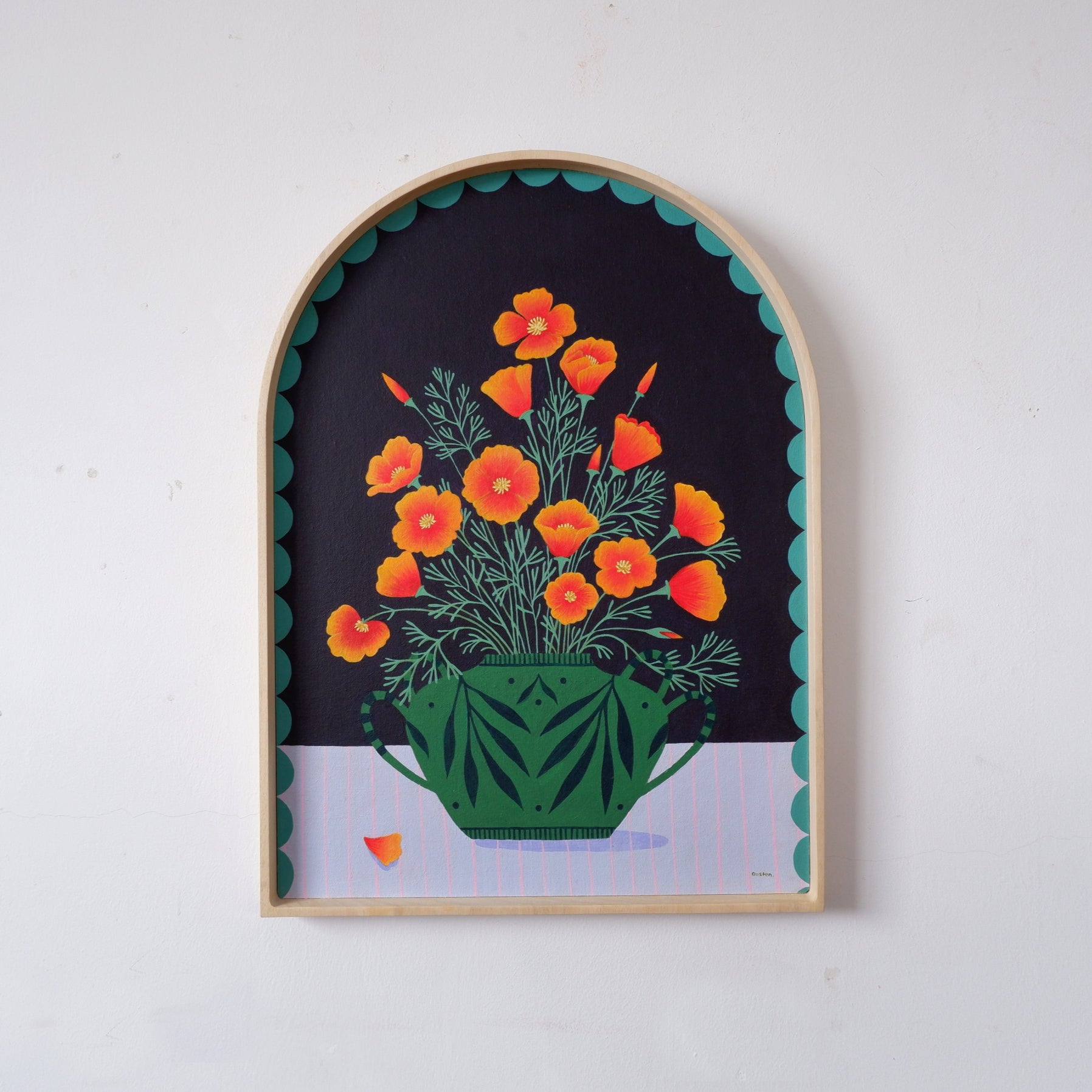 Towards the end of 2023, much transpired; both joyful and heartbreaking, challenging and freeing, and, in the midst of it all, I began to make flower paintings. I worked freely, choosing bold colours at whim, adding patterns and motifs to vases and tablecloths freehand and overall, extending my sketchbook play, outside of my sketchbook.