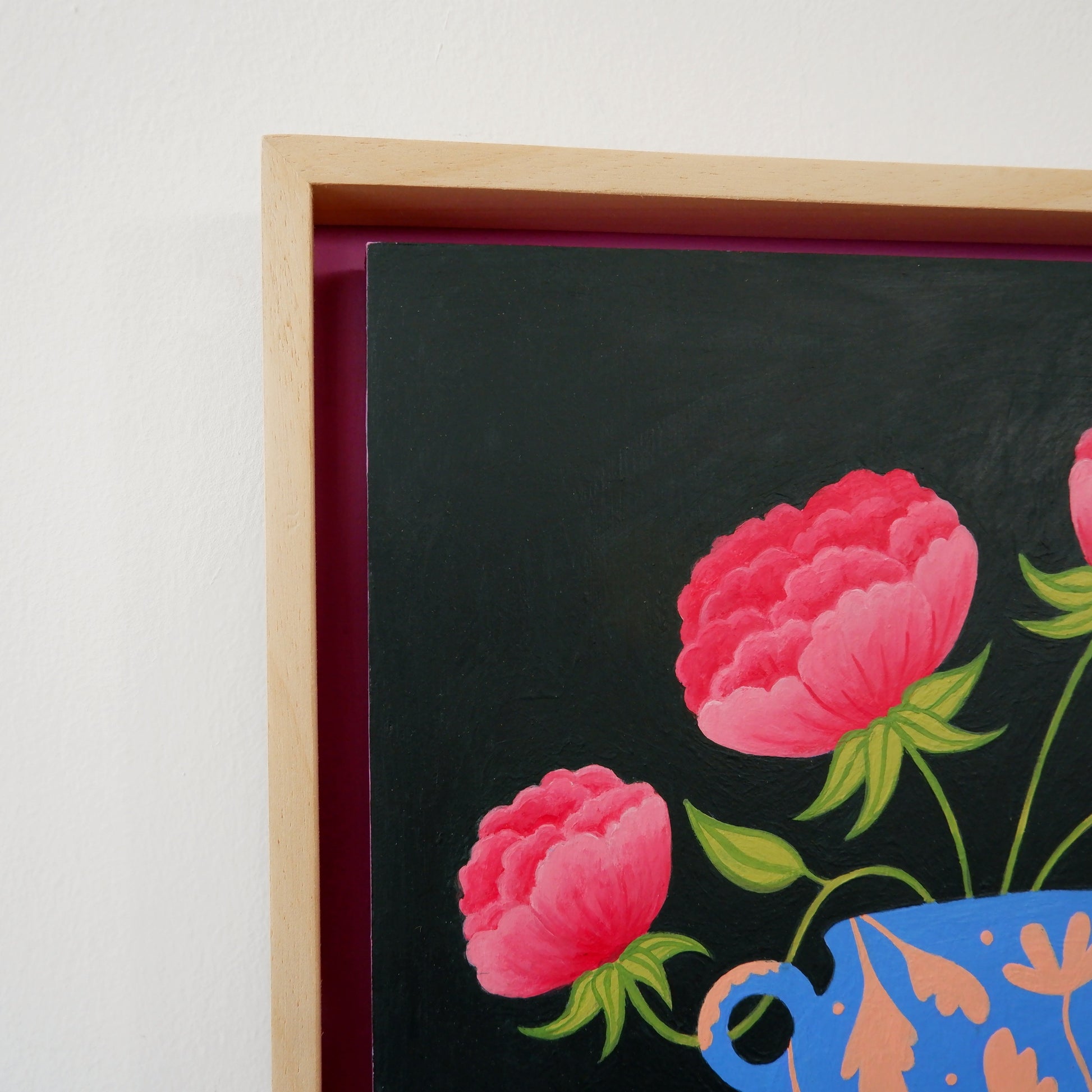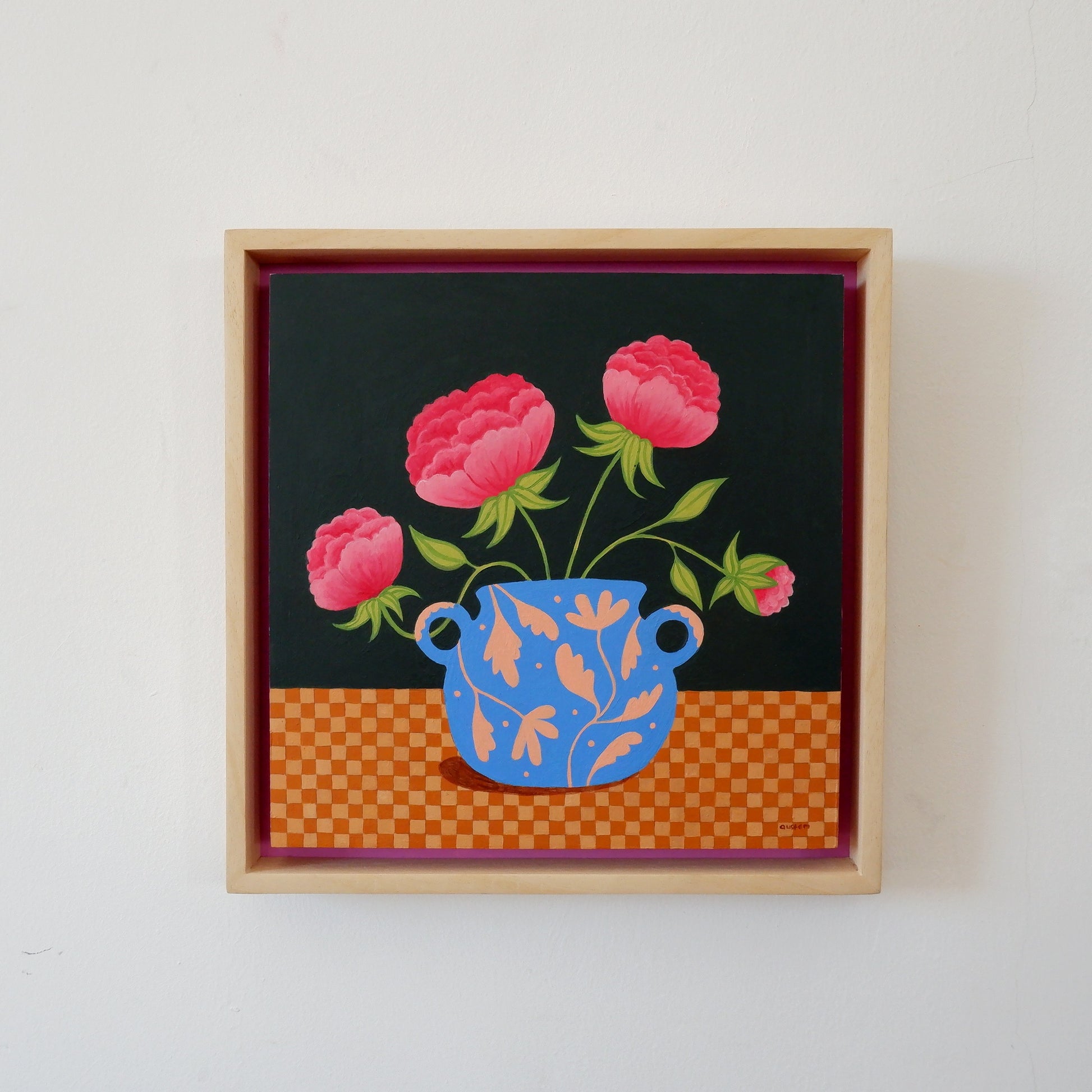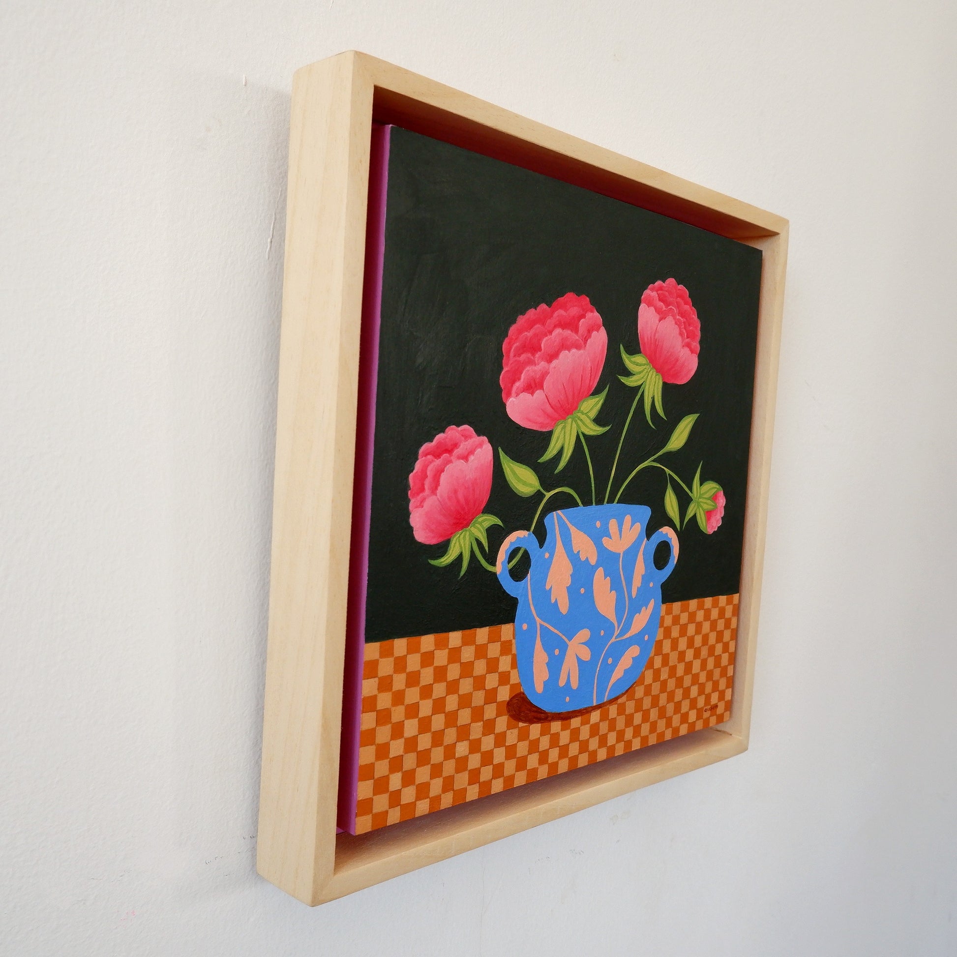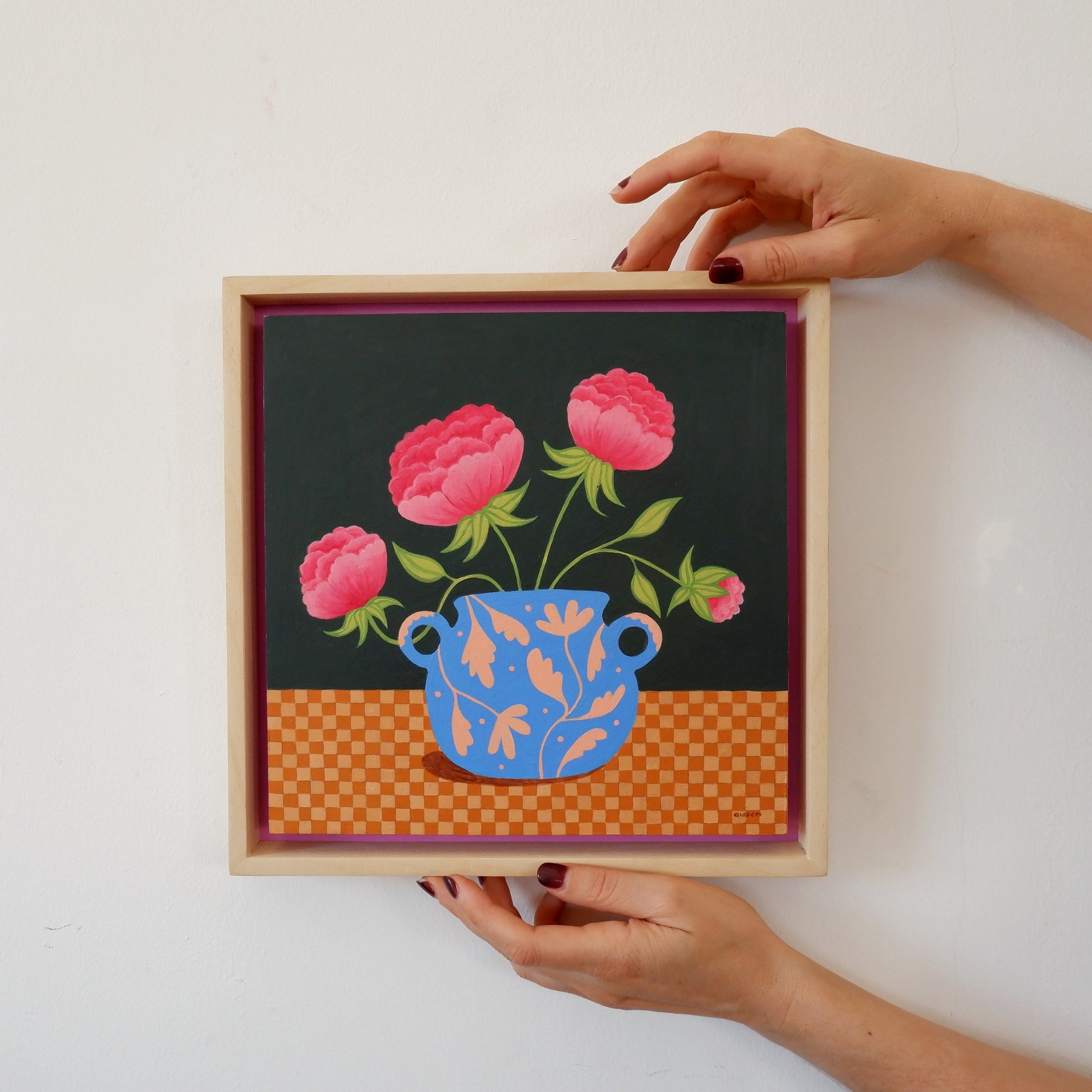 Framed in natural wood with an acrylic painted backboard