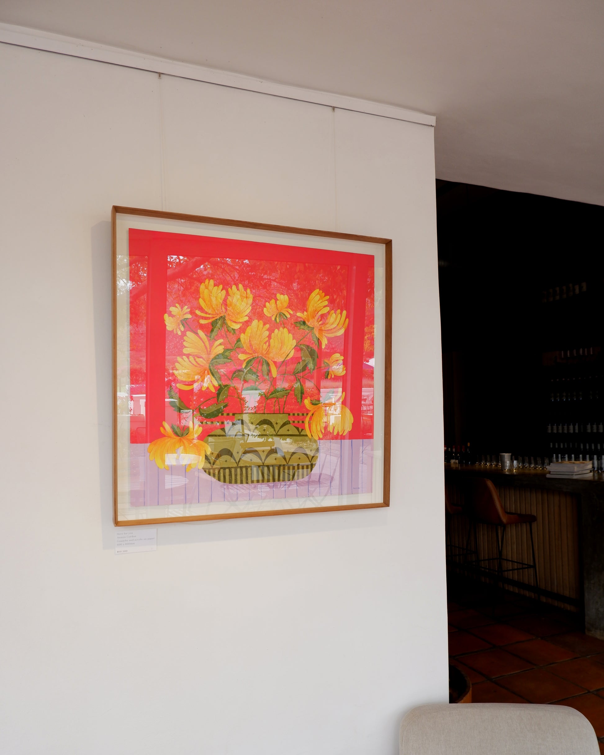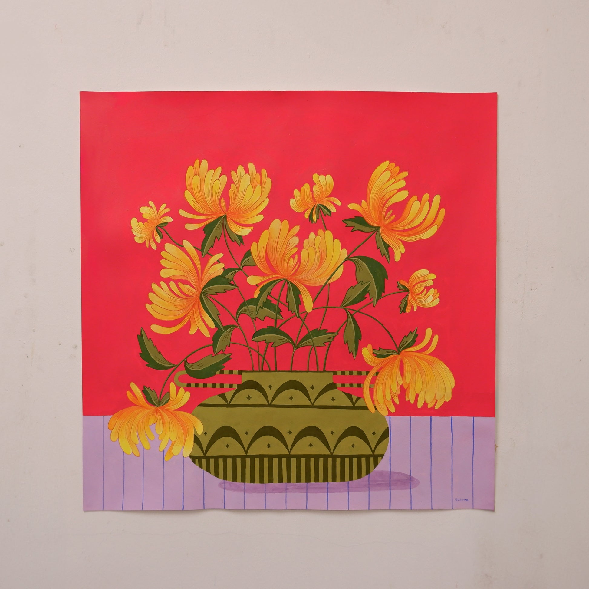 Towards the end of 2023, much transpired; both joyful and heartbreaking, challenging and freeing, and, in the midst of it all, I began to make flower paintings. I worked freely, choosing bold colours at whim, adding patterns and motifs to vases and tablecloths freehand and overall, extending my sketchbook play, outside of my sketchbook.