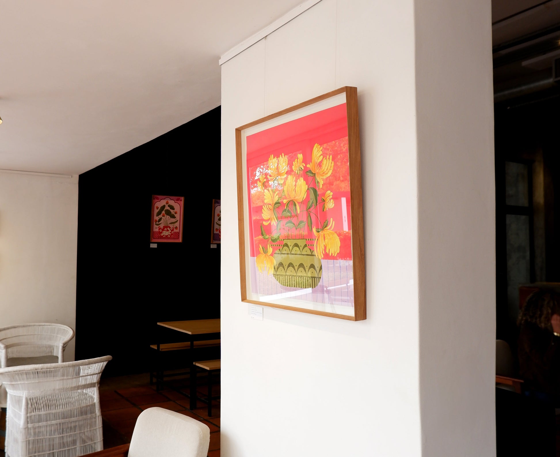 In my work, elements of symmetry, harmony and distinct contrast appear together, paired, as ever, with abounding florals. Carefully selected colours, shapes and patterns represent diversity, abundance and longevity. This show reflects, in titles and essence, what it is to have female friendships.