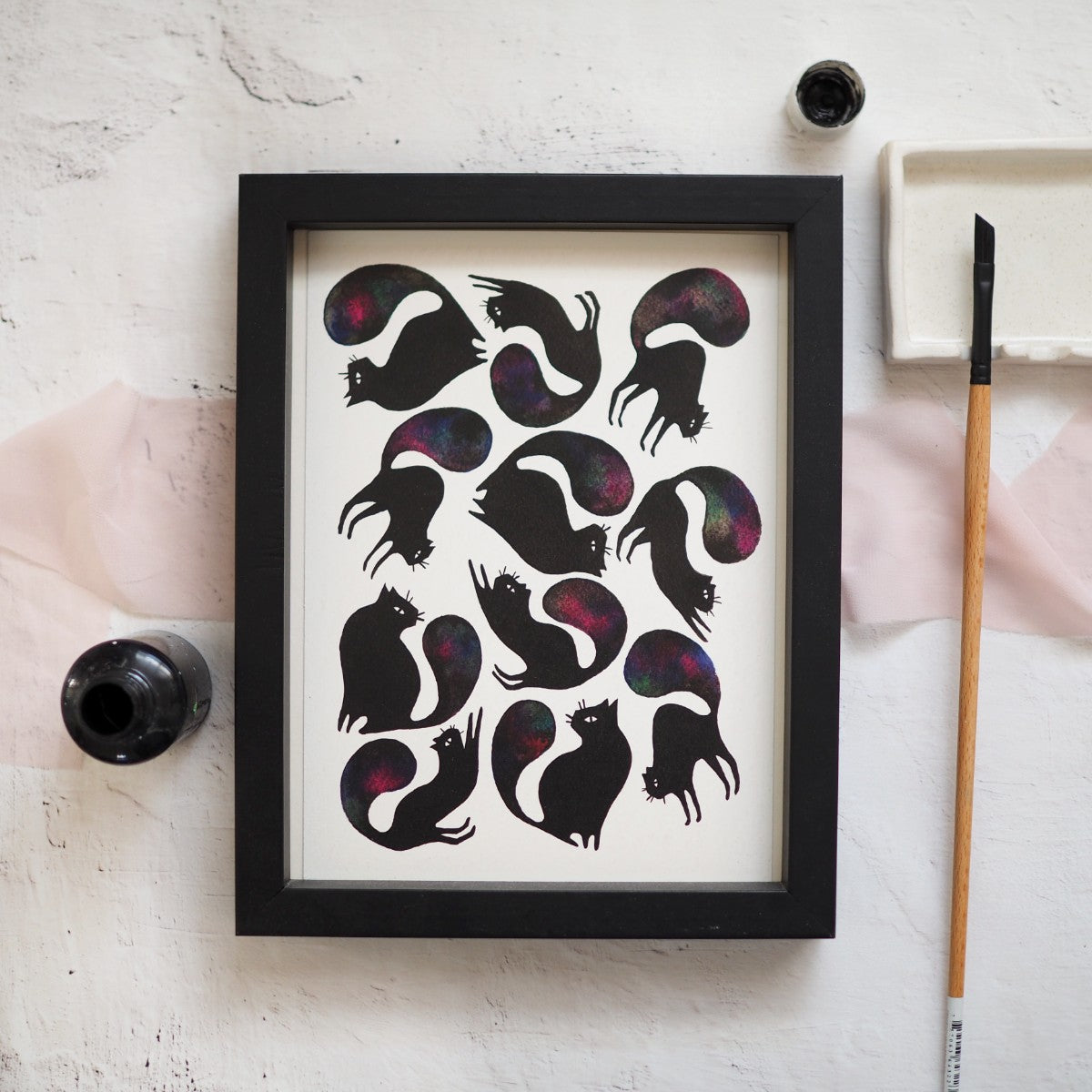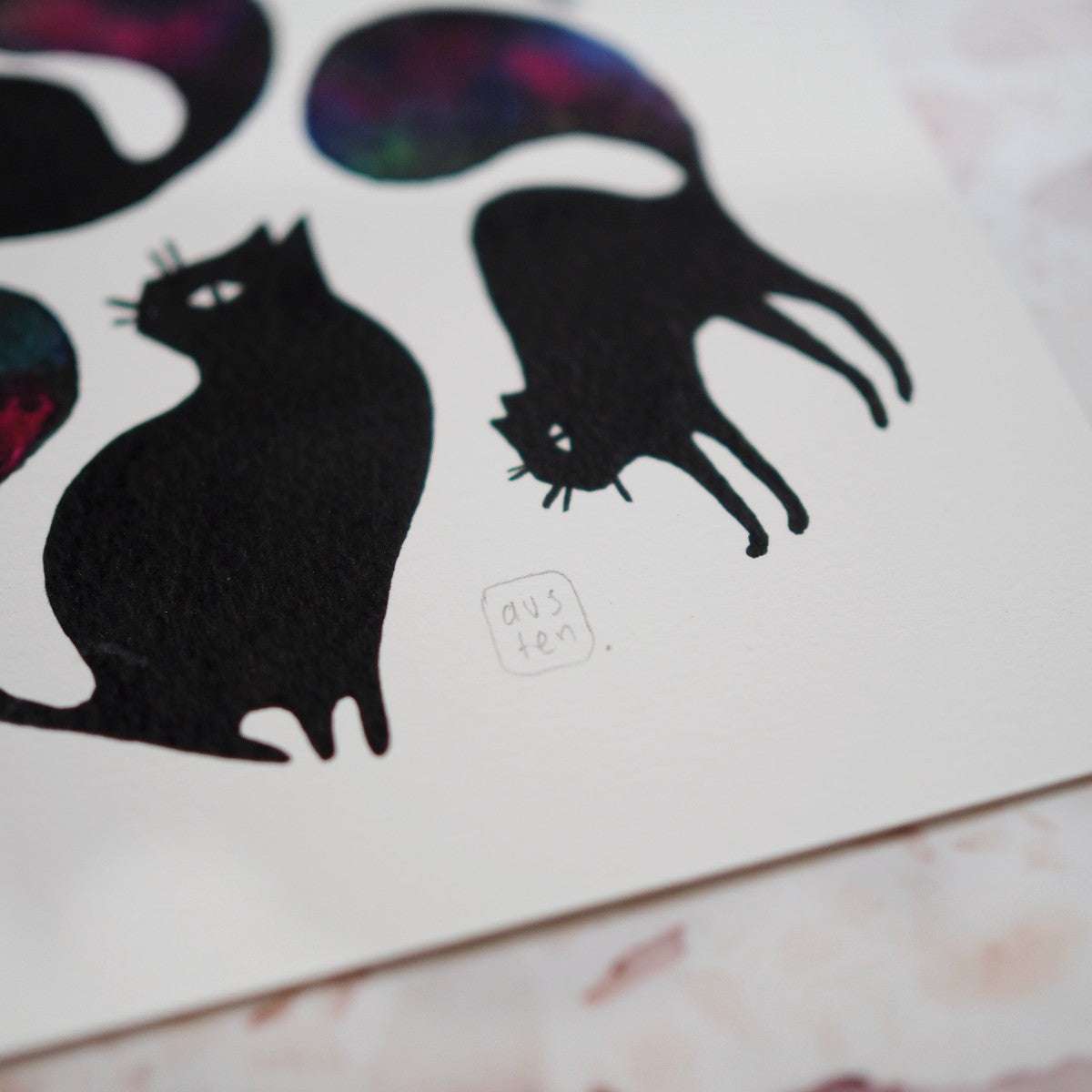 Modelled after my single portraits of Galaxy Cats from 2020, the Inky Kitties Art print features all of the cats arranged in a neat pattern. Their fat tails, with green, blue, purple and fuchsia ink, mixed with black, represent the nebula and the inky black sky…