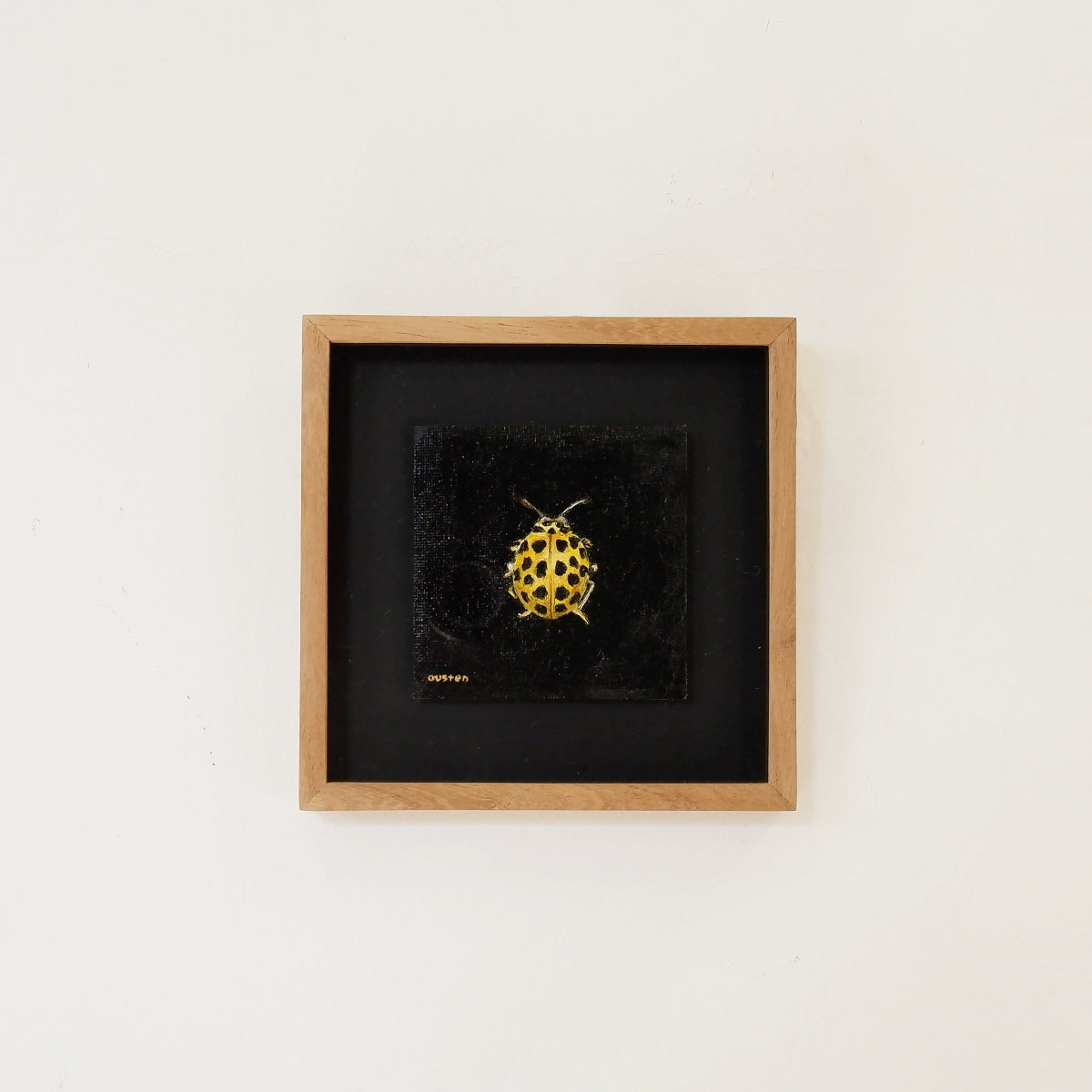 A 22-spot yellow ladybird is painted within a small square of canvas paper.