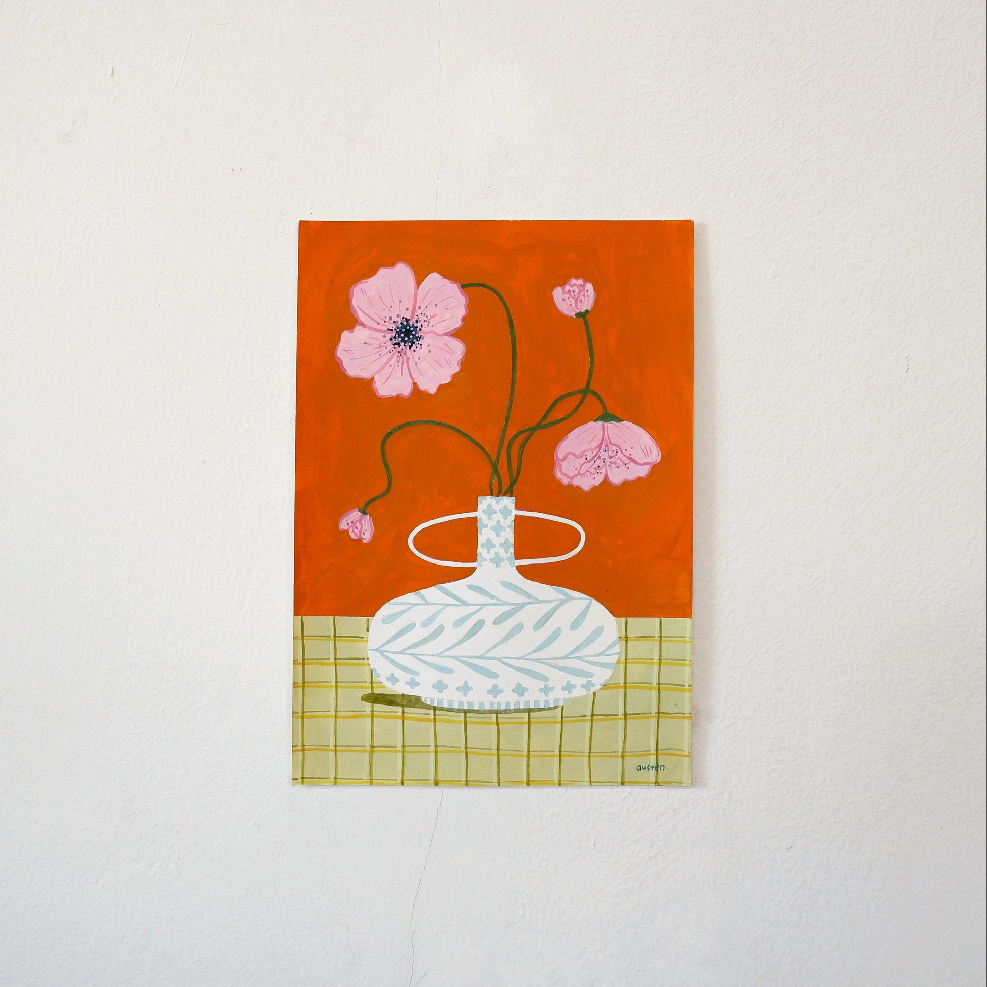 Towards the end of 2023, much transpired; both joyful and heartbreaking, challenging and freeing, and, in the midst of it all, I began to make flower paintings. I worked freely, choosing bold colours at whim, adding patterns and motifs to vases and tablecloths freehand and overall, extending my sketchbook play, outside of my sketchbook.