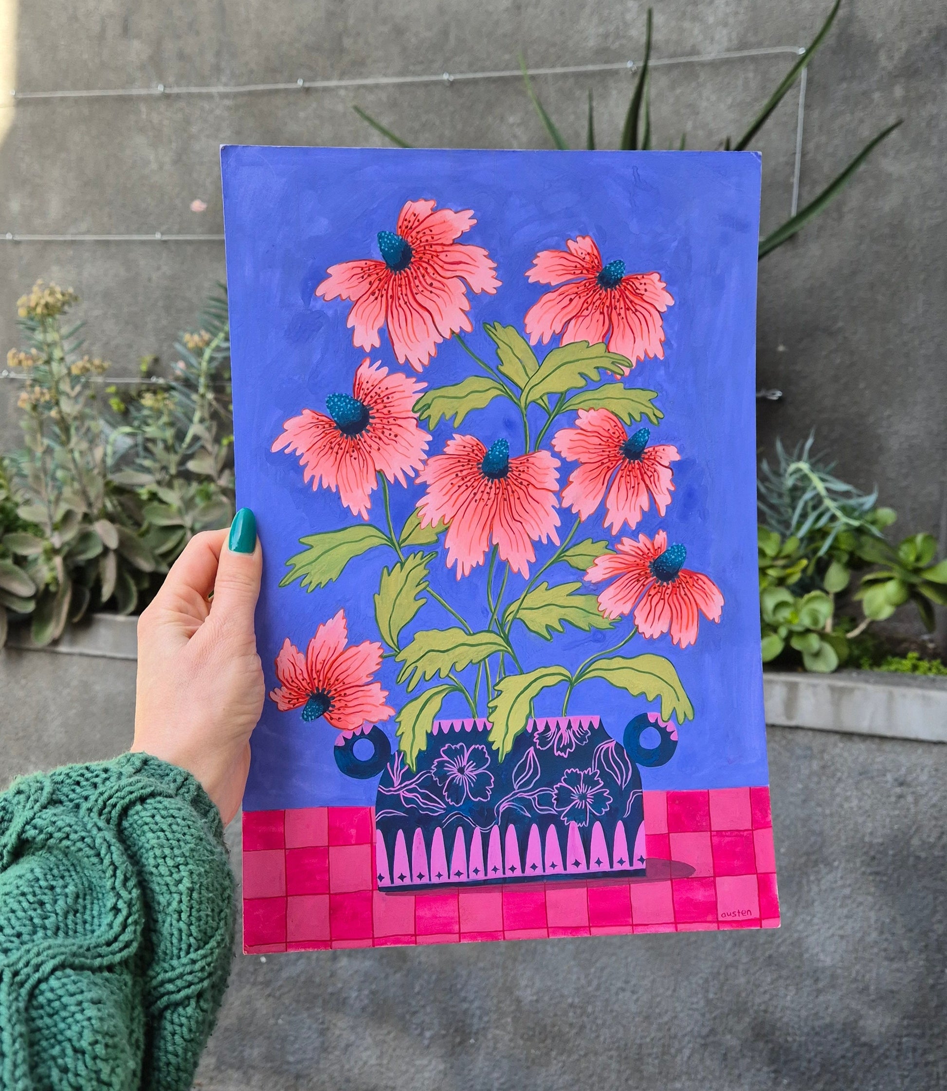 Towards the end of 2023, much transpired; both joyful and heartbreaking, challenging and freeing, and, in the midst of it all, I began to make flower paintings. I worked freely, choosing bold colours at whim, adding patterns and motifs to vases and tablecloths freehand and overall, extending my sketchbook play, outside of my sketchbook.