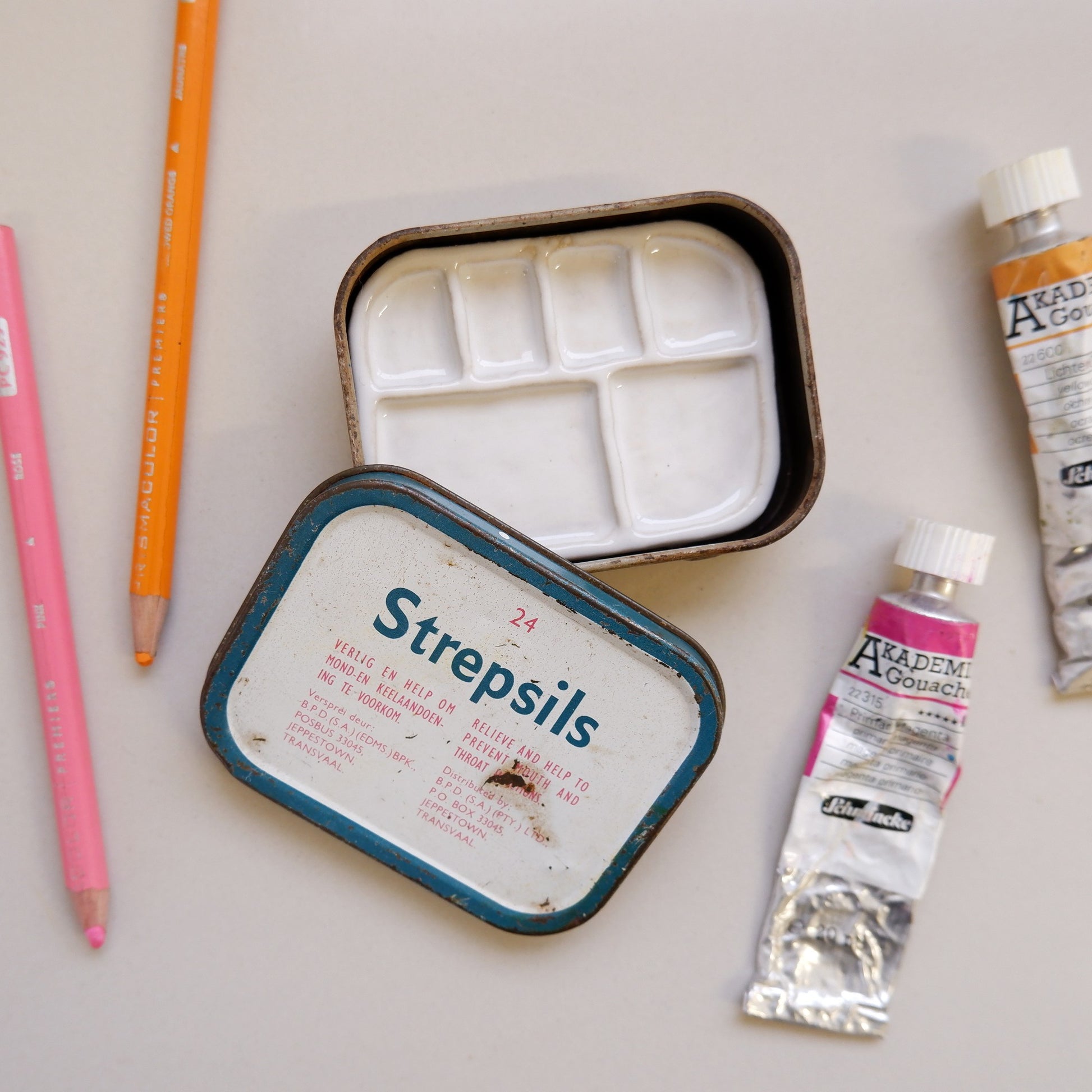 Meet the paint tin! The ultimate companion for travelling, quick lunch break art and pock-book sketching, the paint tin comes complete with an inbuilt, hand-formed, ceramic paint holder and mixing wells.